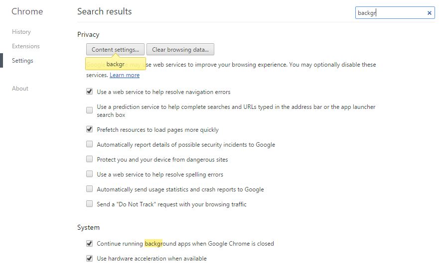 - Now in Chrome, go to Settings and type “background” inside the search box.